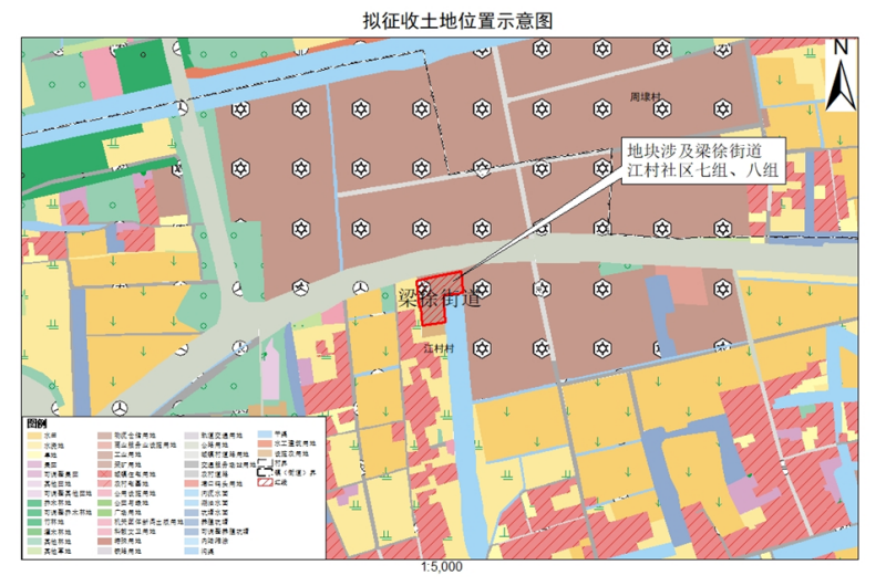 本次拟征收土地位于梁徐街道江村社区七组、八组。拟征收面积0.4250公顷。拟征收土地位置详见附图。